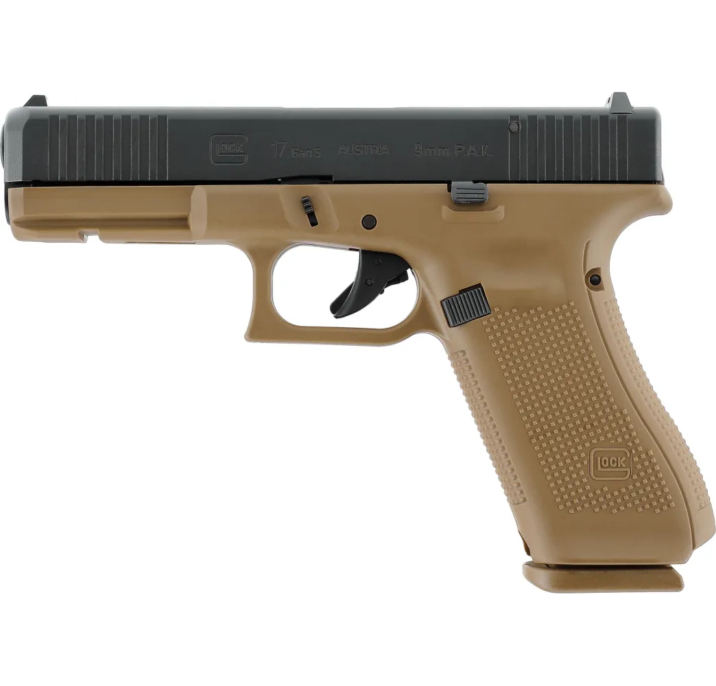 Sichern Sie sich Ihr Modell GLOCK 17 Gen5 Coyote als perfekt abgestimmte Schreckschusspistole mit Top-Magazin und Zubehör-Kompatibilität!